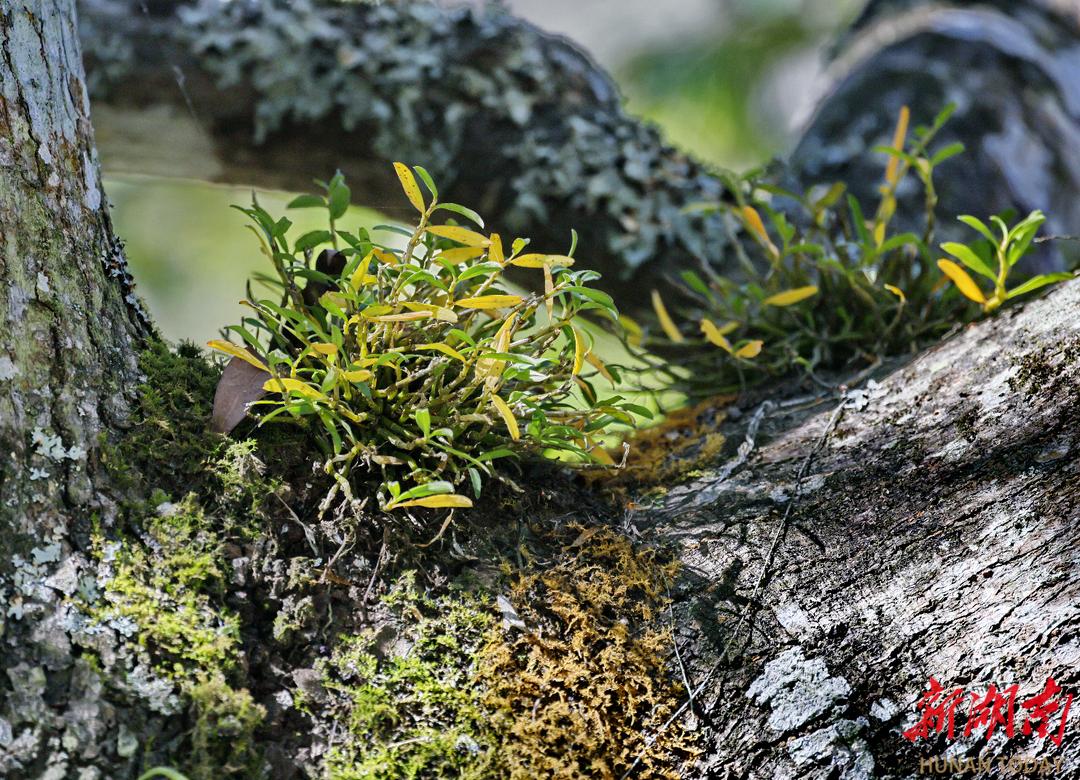 位于绥宁县的南山国家公园候选区黄桑片区,刨花润楠树干上布满河南石斛,长势良好。近日,该片区科研人员巡查时记录到这种国家二级保护植物。这是该区域自2013年以来首次发现野生种群,标志着当地生态保护工作取得显著成效。
