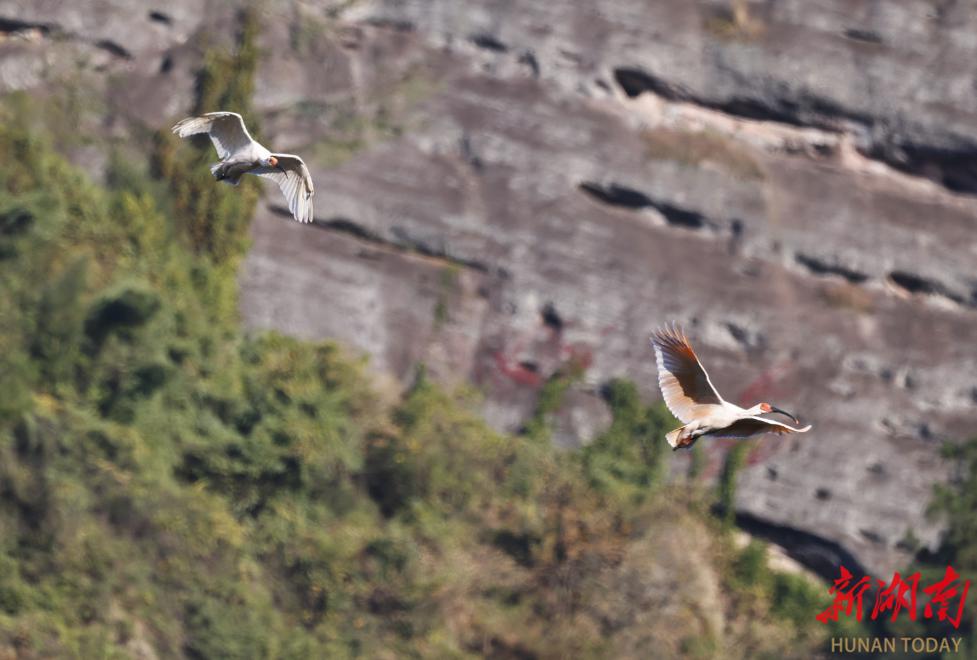 2022年以来,南山国家公园候选区在崀山片区野化放归24只朱鹮,迄今已成功孵化17只幼鸟,成为全球纬度最低的朱鹮野生种群繁育地。