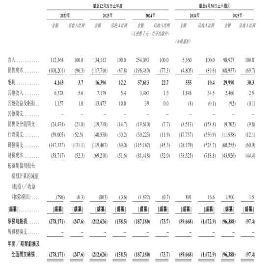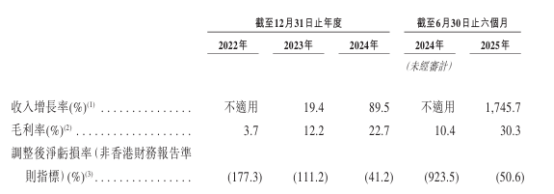 财务数据上,公司的成长曲线引人关注,其营收规模从2022年的1.12亿元(人民币,下同)增至2024年的2.54亿元,复合年增长率达50.4%,今年上半年营收更是增长逾17倍。盈利能力的改善更为突出,毛利率由2022年的3.7%,跃升至2024年的22.7%,今年上半年进一步攀升至30.3%。