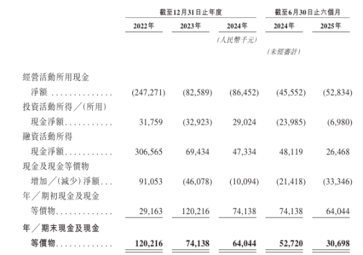 不过,光鲜数据背后,公司的的财务压力却不容忽视。尽管营收与毛利增长迅猛,但公司自成立以来始终未能摆脱净亏损状态。2022年至2024年的净亏损分别为2.78亿元、2.13亿元及1.87亿元,虽亏损额呈逐年收窄趋势,但三年累计亏损近6.8亿元,直接导致现金流陷入紧张。截至2025年6月30日,公司净负债已高达到了10.78亿元,同时在手现金也仅剩3069.8万元,资金链的紧绷成为其奔赴港股融资的核心动因之一。