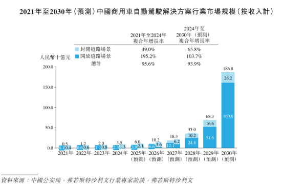 中国商用车自动驾驶解决方案主要应用于封闭道路和开放道路场景两大运营场景。从2021年到2024年,中国封闭道路场景下商用车自动驾驶解决方案的市场规模从4亿元增长至13亿元,复合年增长率为49.0%,主要驱动力来自运营效率提升、人力成本优化及安全保障增强的持续需求。展望未来,随着自动驾驶解决方案可靠性的持续提高和数字基础设施加速普及,预计到2030年,市场规模将达到262亿元,2024年至2030年复合年增长率将维持65.8%的高位。